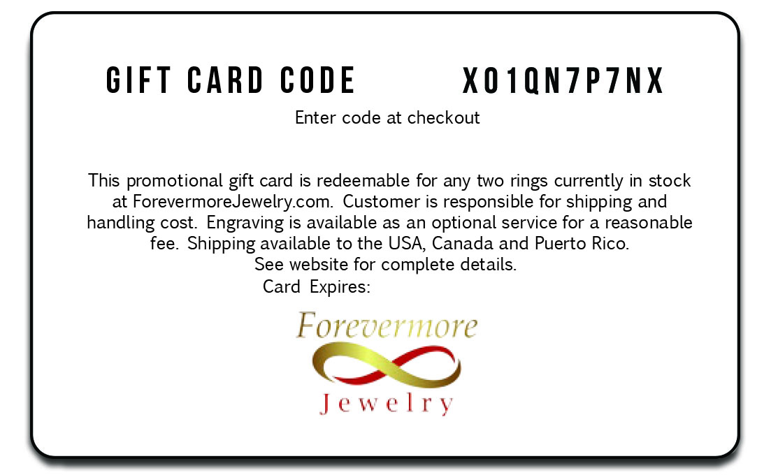 2. At checkout, enter the Gift Card Code. The cost of the two rings you select will be deducted. You are only responsible for shipping and handling cost and, if desired, engraving cost.